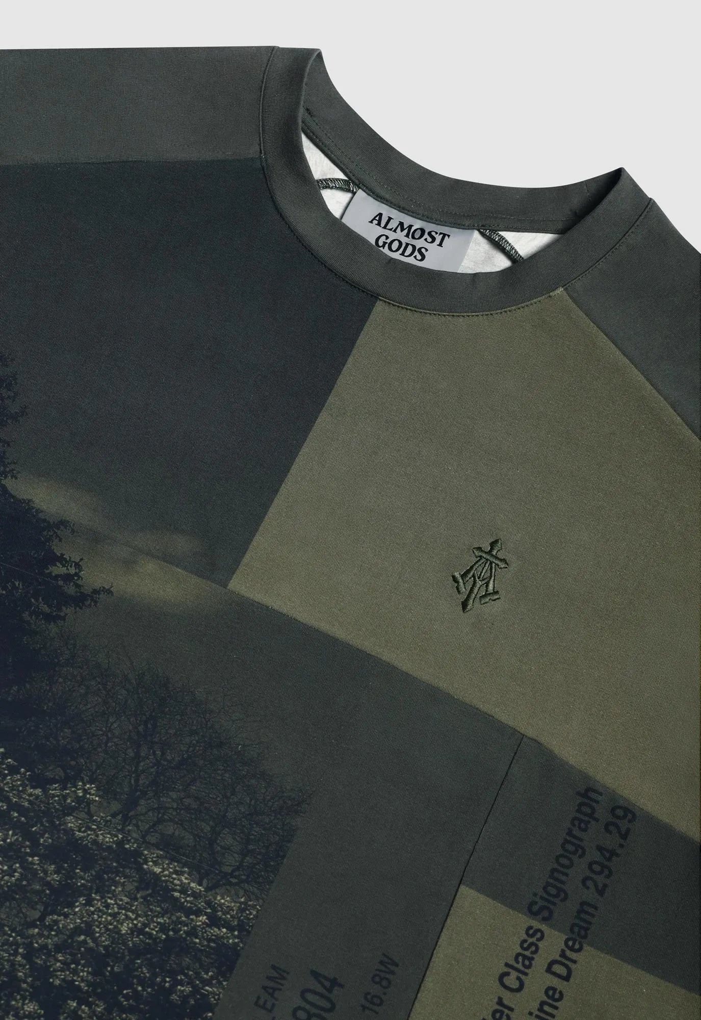 Oversized tee featuring a paneled construction inspired by Kunel Gaur’s artwork.
