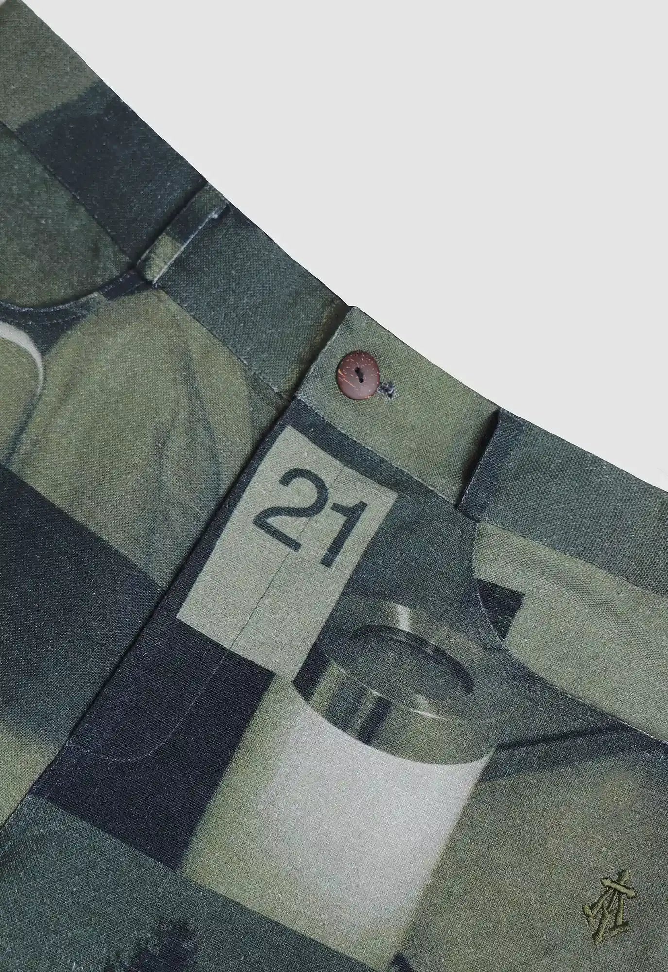 Cotton Canvas shorts featuring a paneled construction inspired by Kunel Gaur’s artwork.