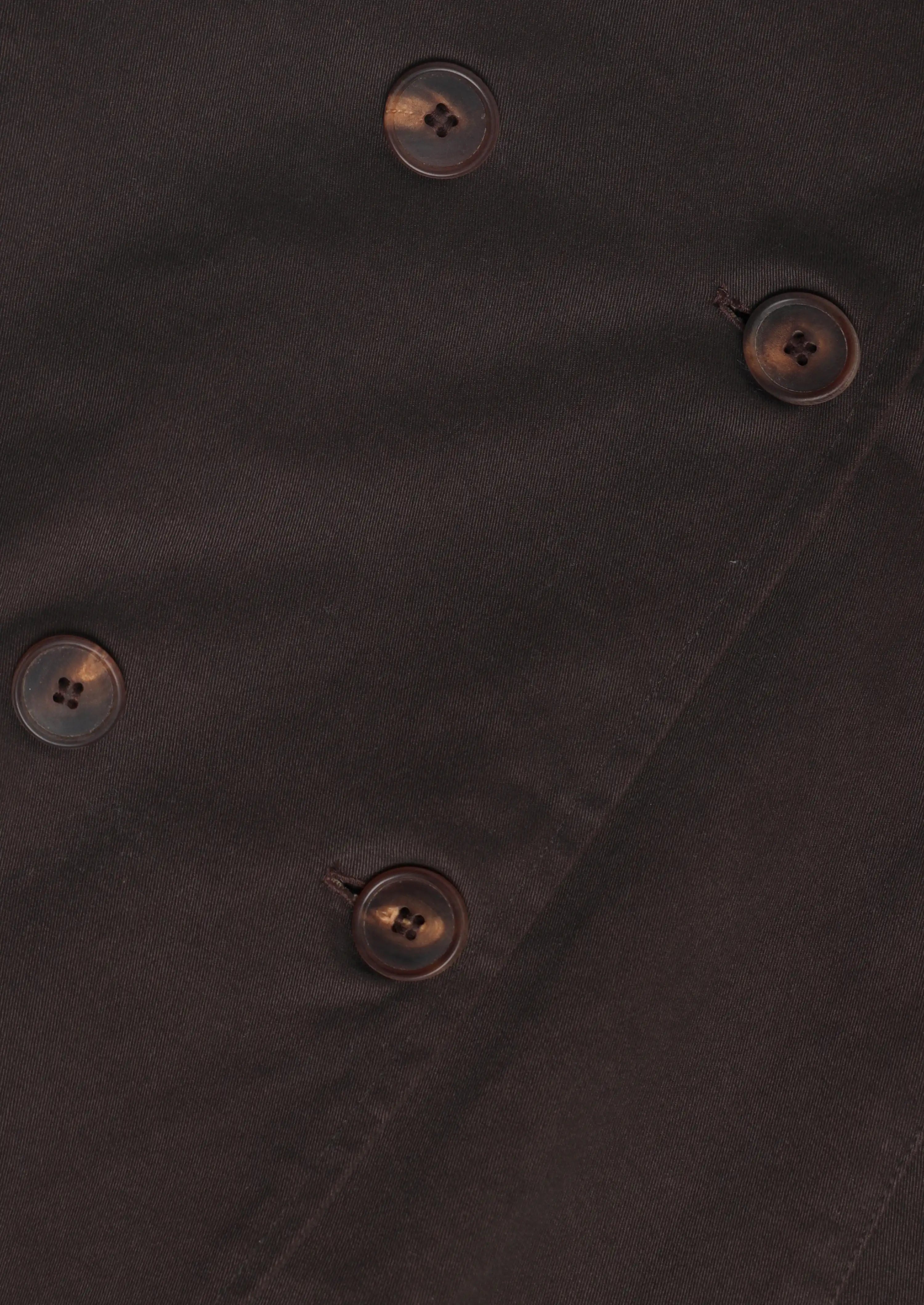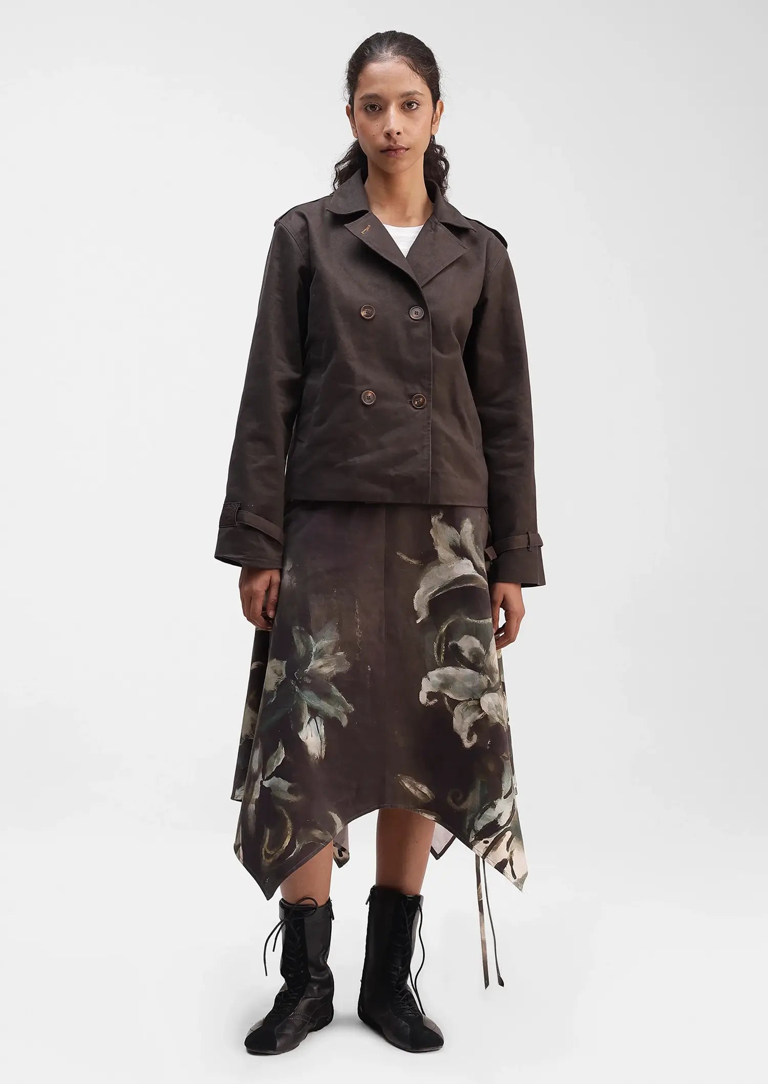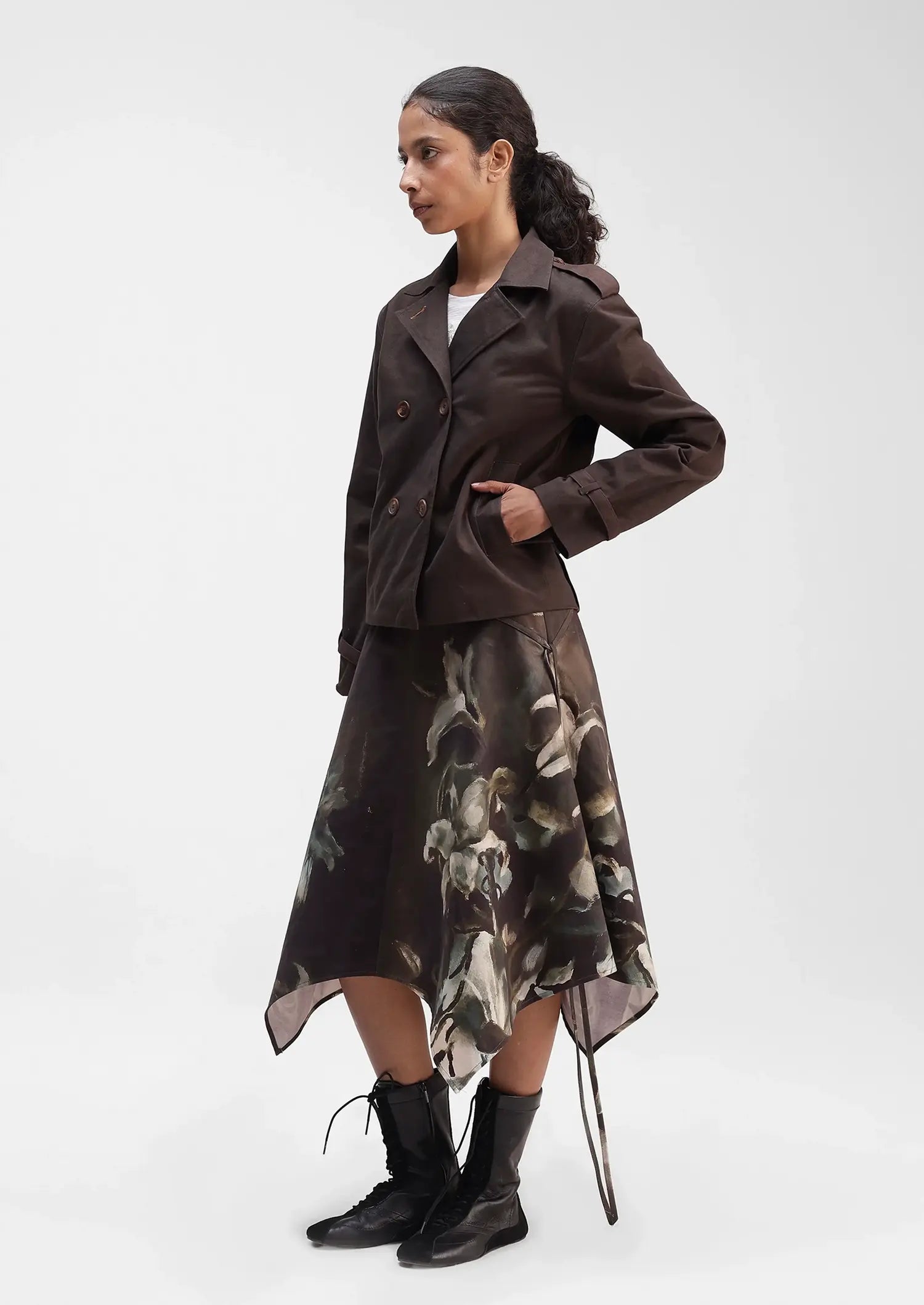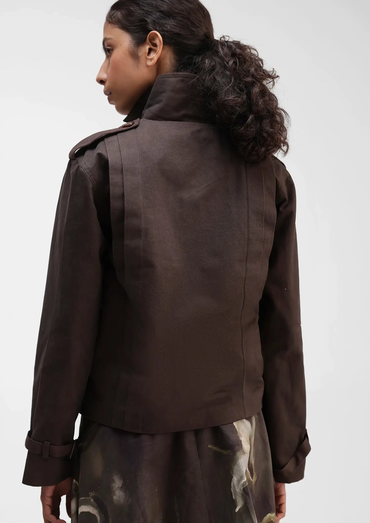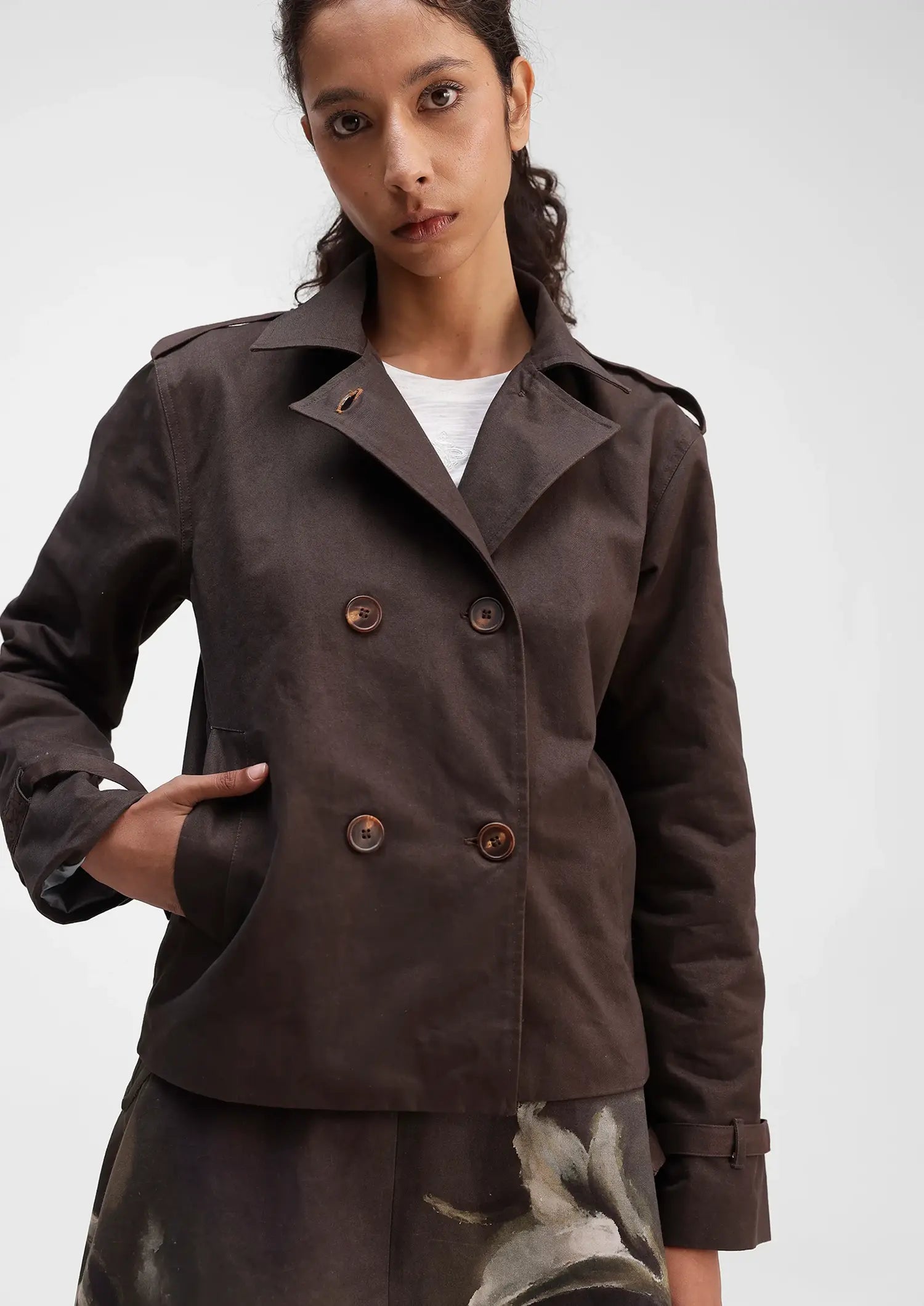 A cropped trench coat that reworks the classic silhouette through proportion and structure, retaining the essence of a traditional trench while introducing a more compact, controlled form.