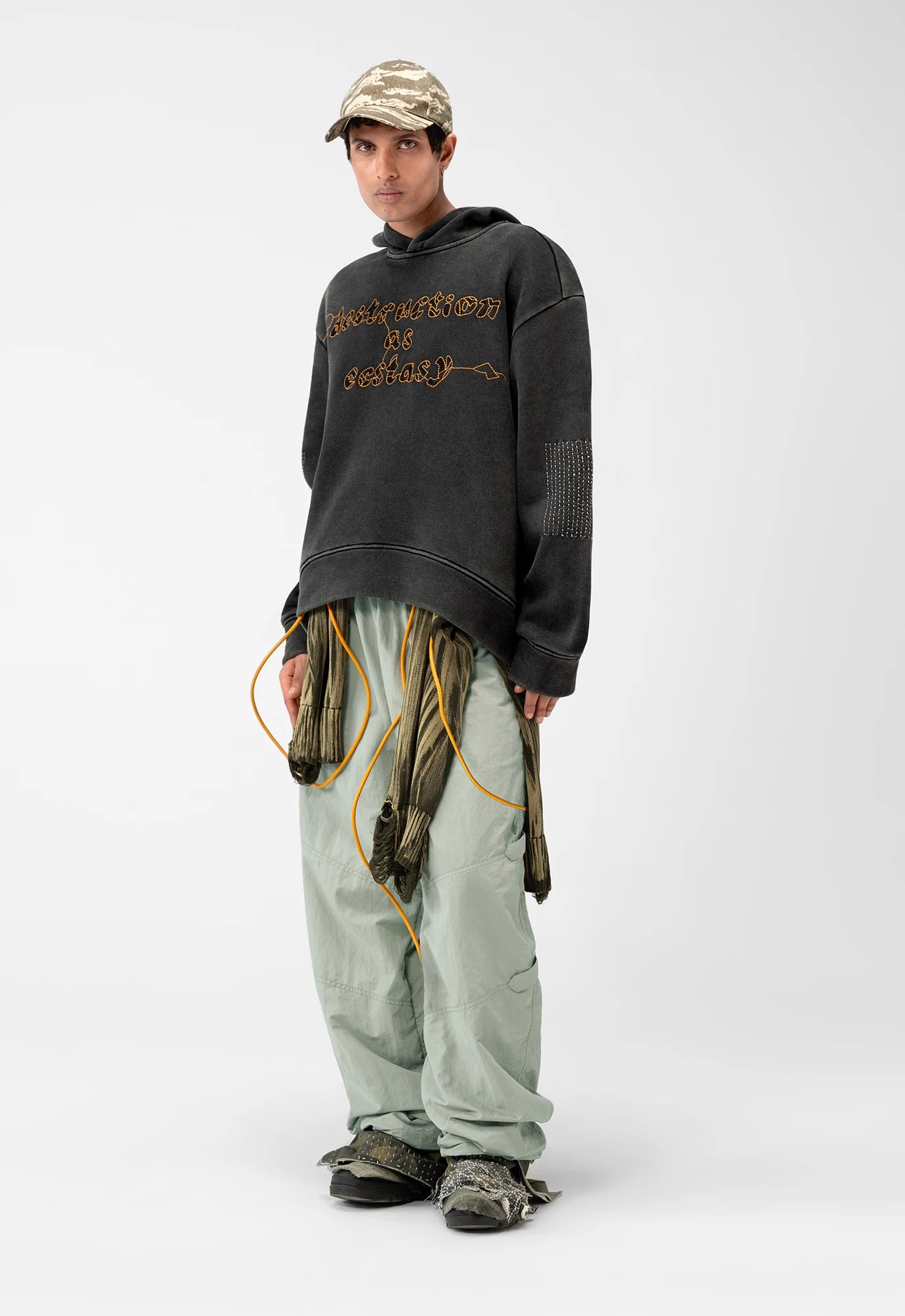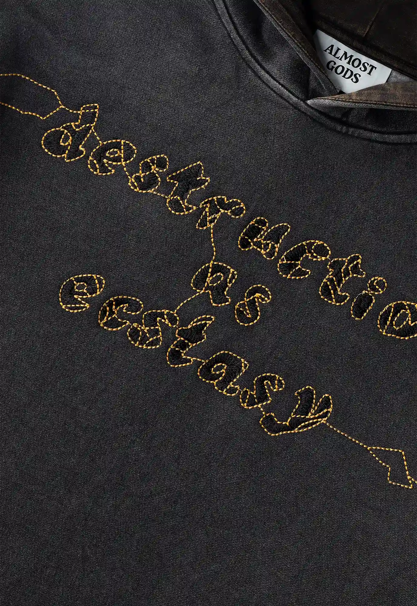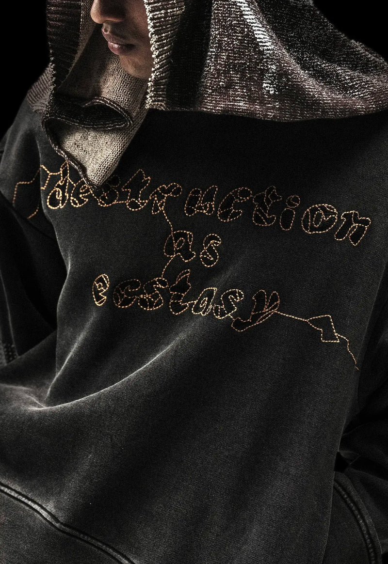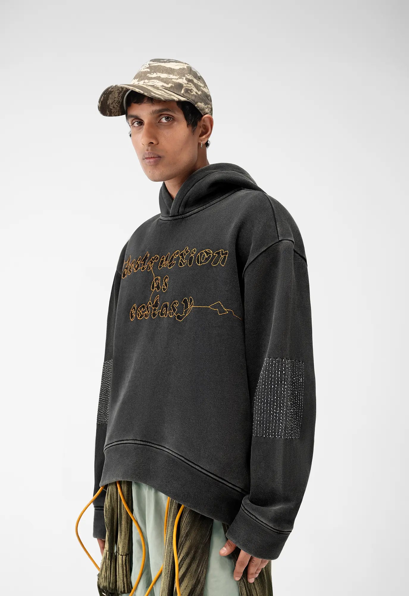 Drop-shoulder cropped fleece hoodie with ‘Destruction as Ecstasy’ embroidered on the front, acid-wash finish, and Kantha-embroidered elbow patches.