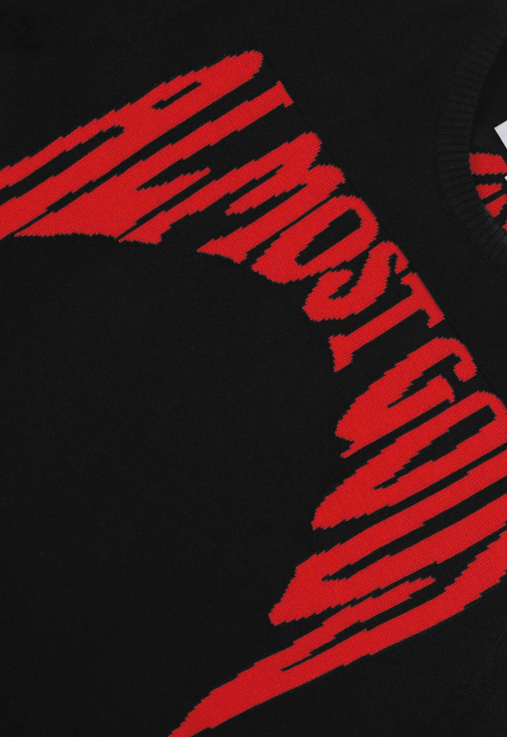 Long sleeve knit sweater. Boxy fit. Almost Gods Gothic Logo in front.