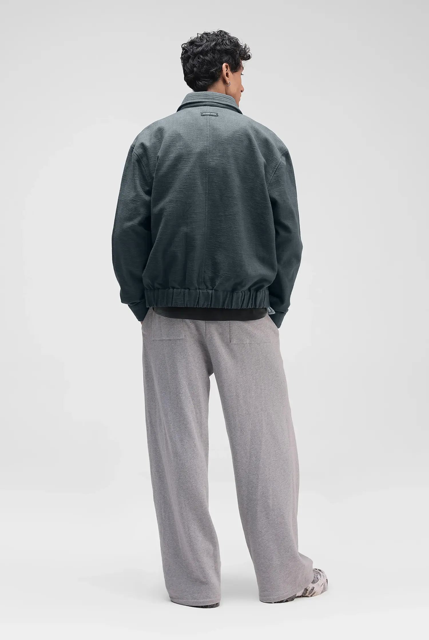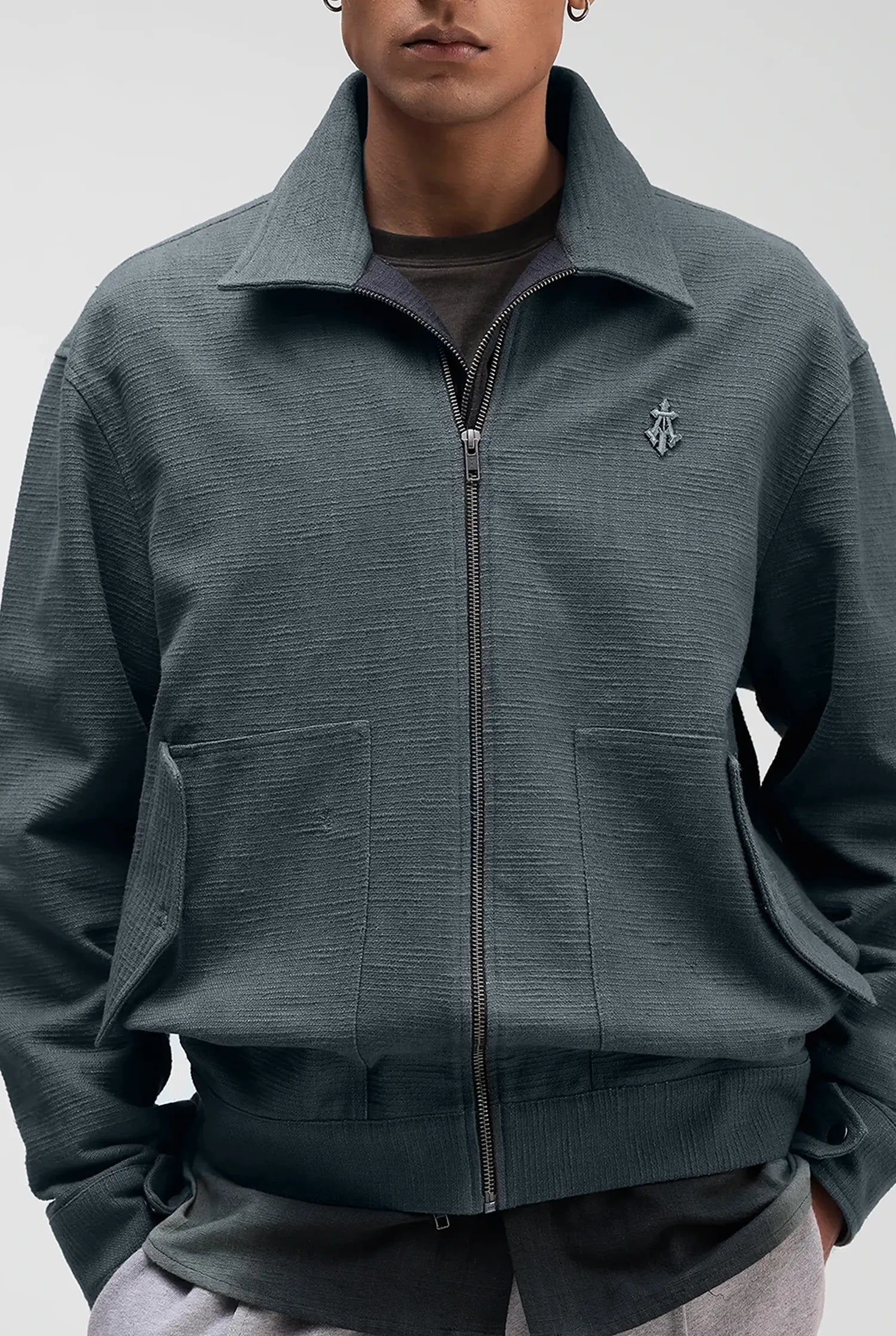 A relaxed fit jacket designed around a dual-zip front that allows the silhouette to shift through wear, altering volume and structure depending on how it is fastened with a two-tone treatment.