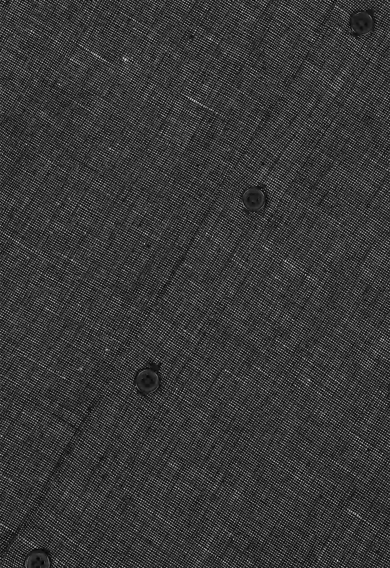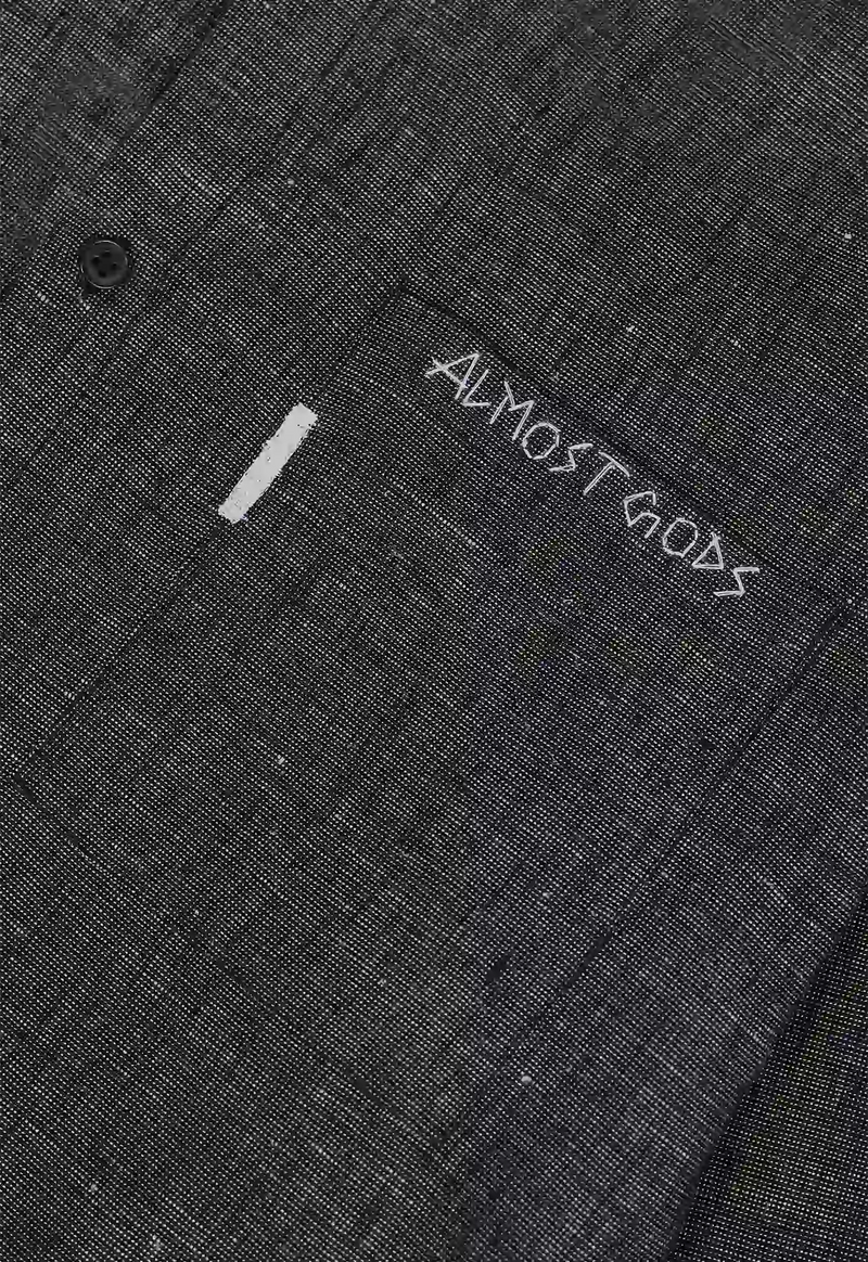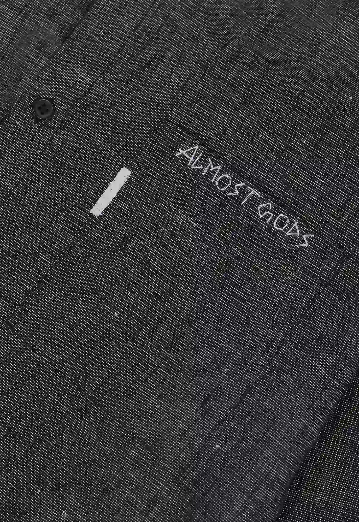 A linen shirt made from shaded yarn featuring a torn flag embroidered at the back.