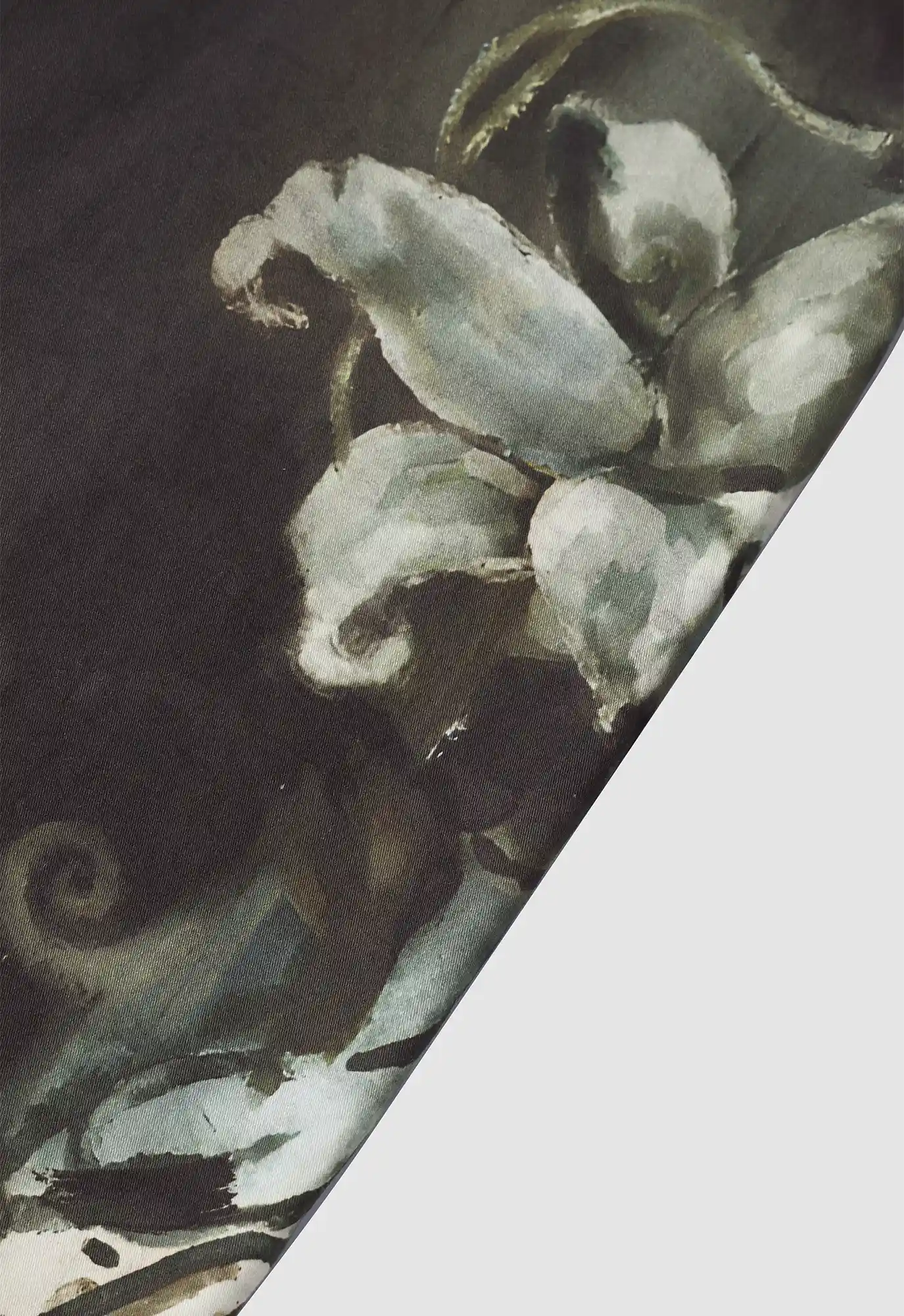 Barrel-leg pants built around a curved yoke and softened structure, featuring an eroded lily print across the body with a clean yoke.