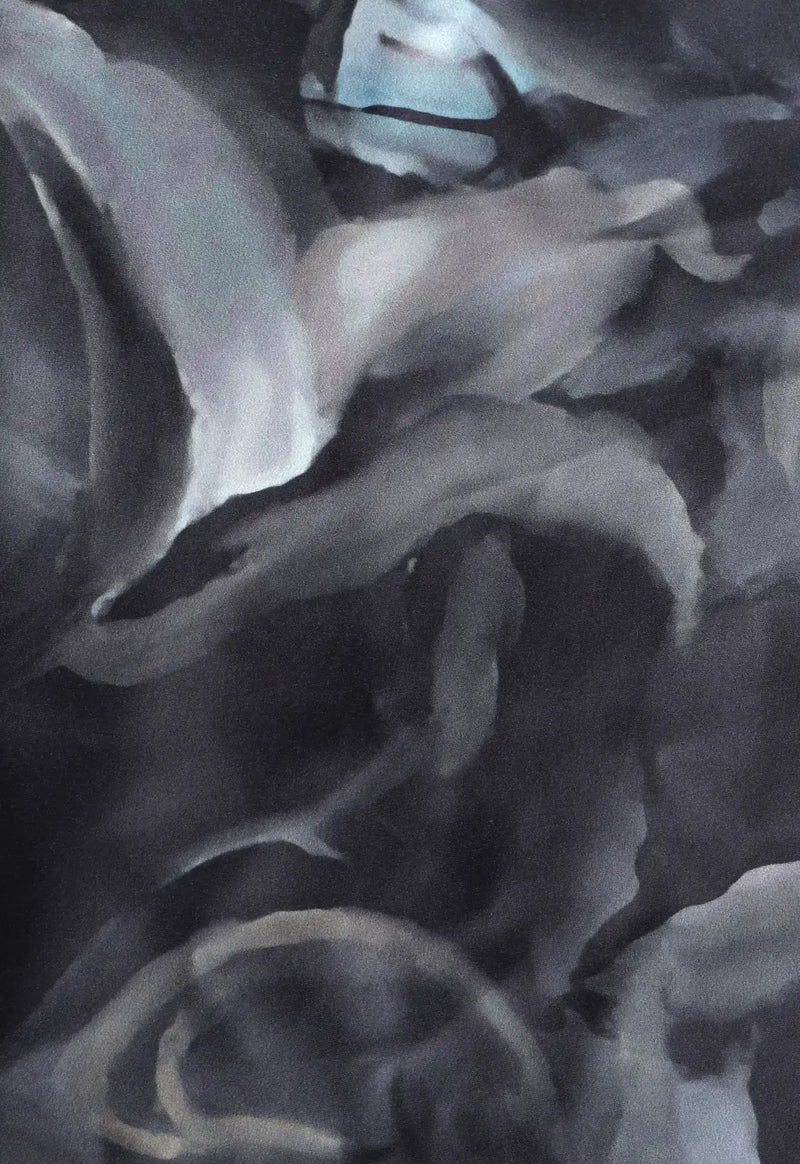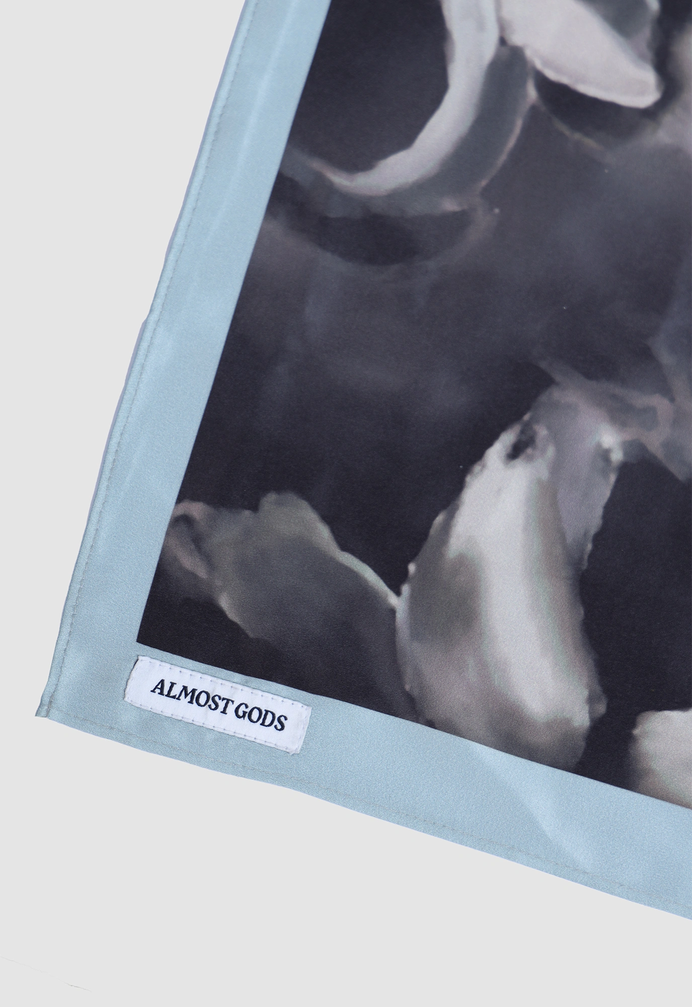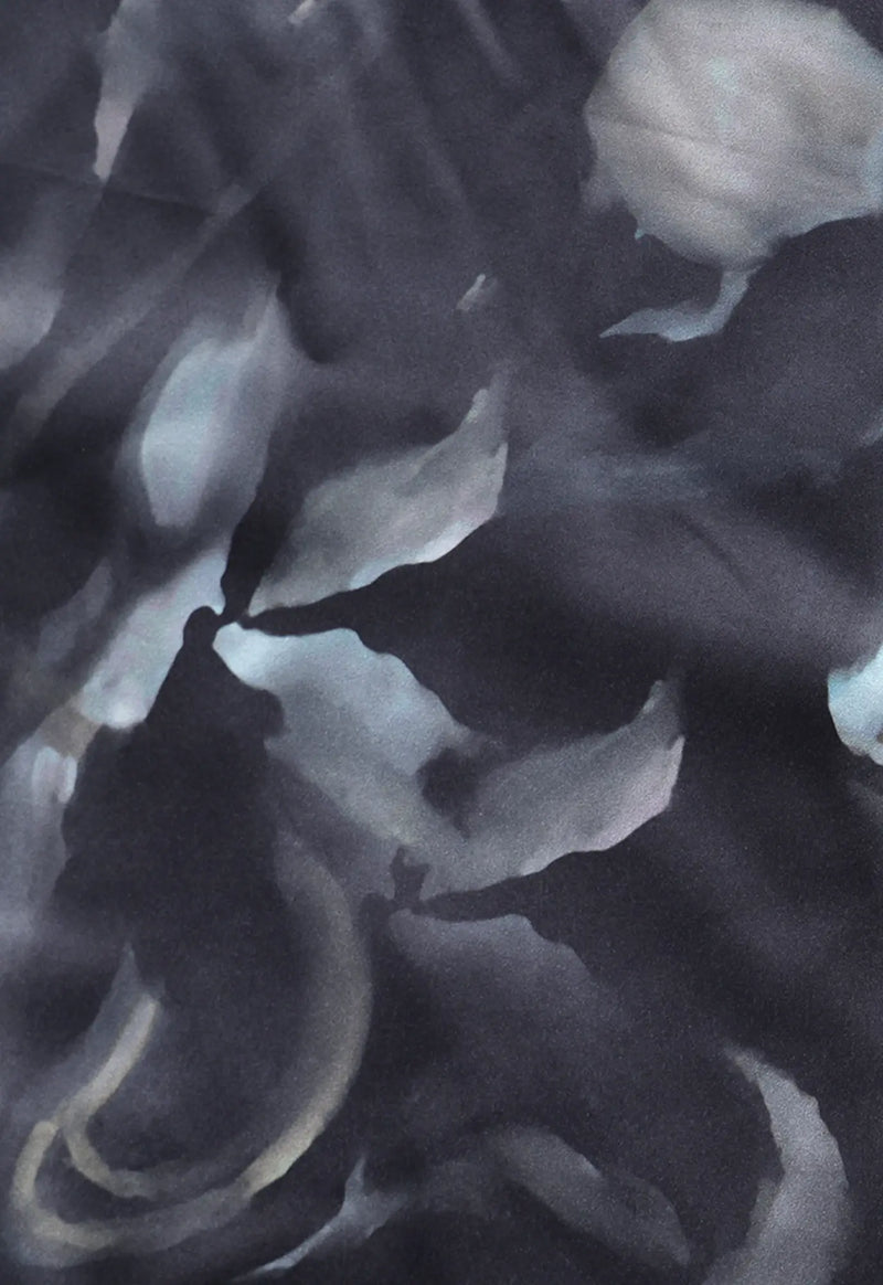 A soft Dutch satin scarf featuring a floral lily print with a watered-down, eroded finish.