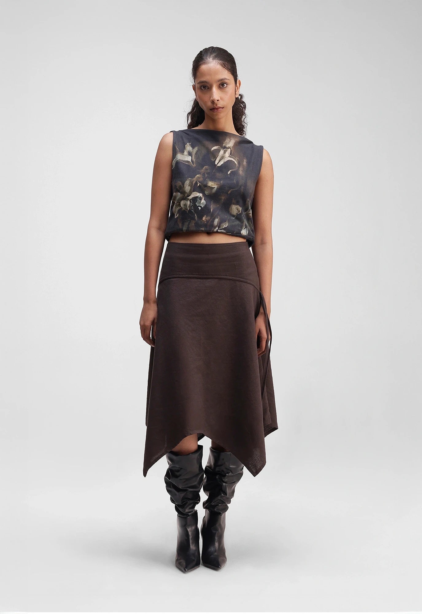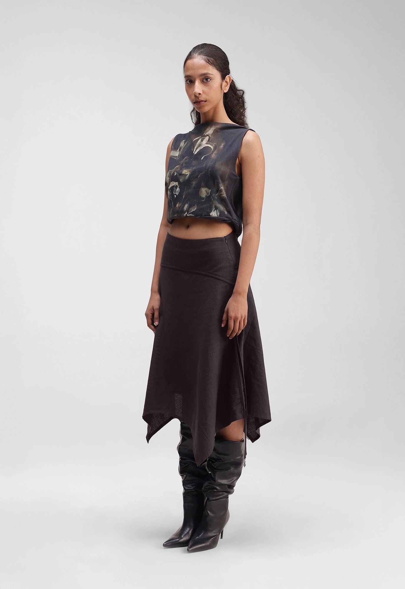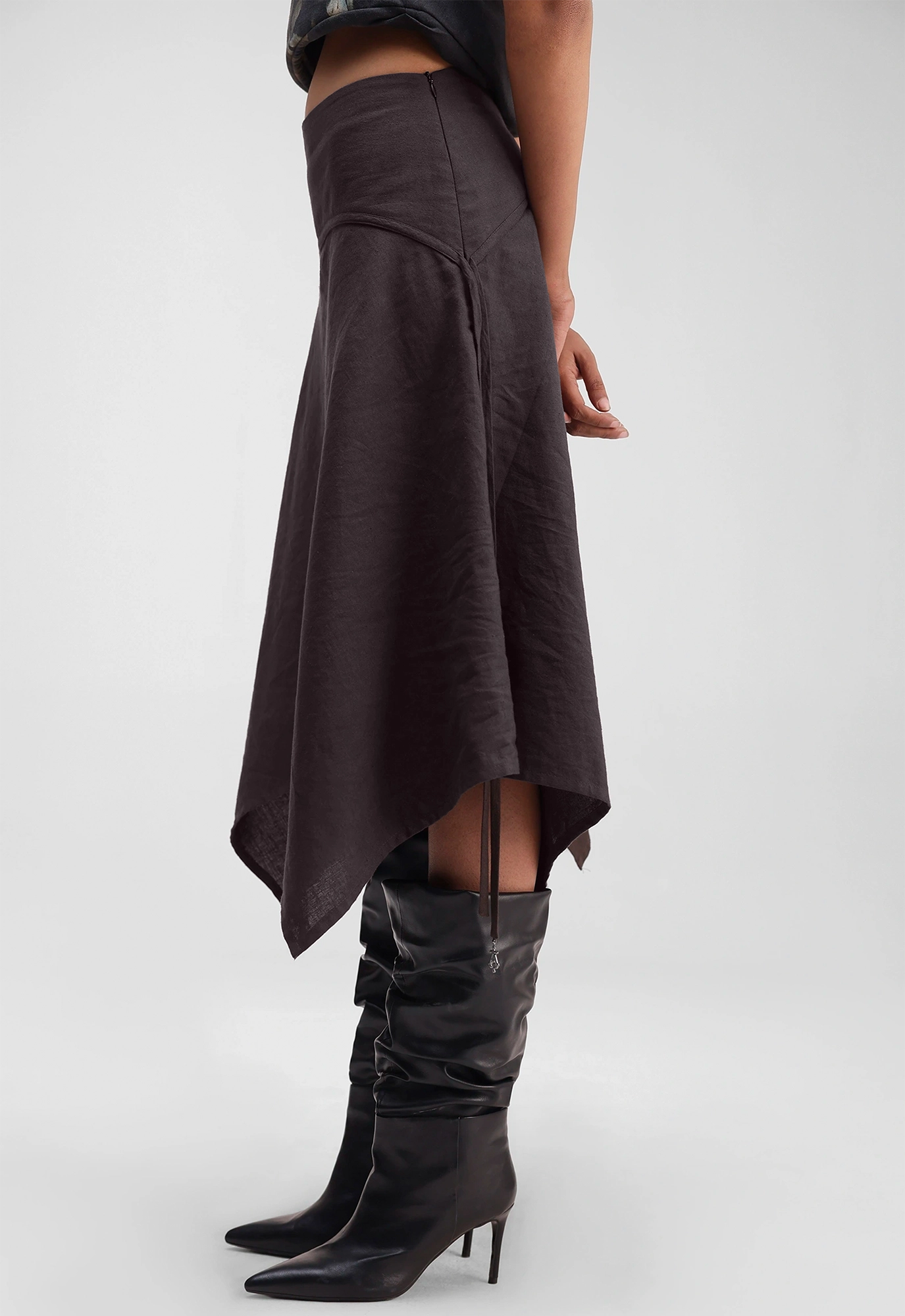 Asymmetric hem skirt with a curved waistband, featuring signature Alpha Cross with the piping.