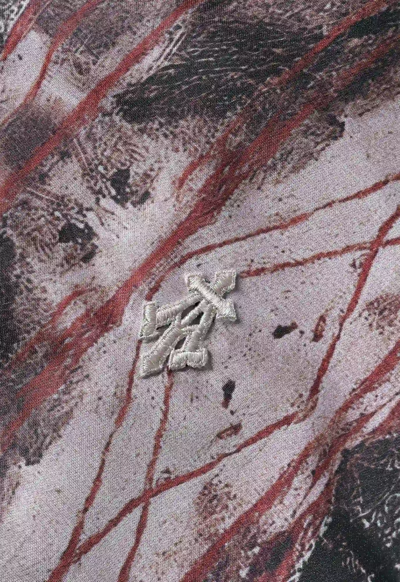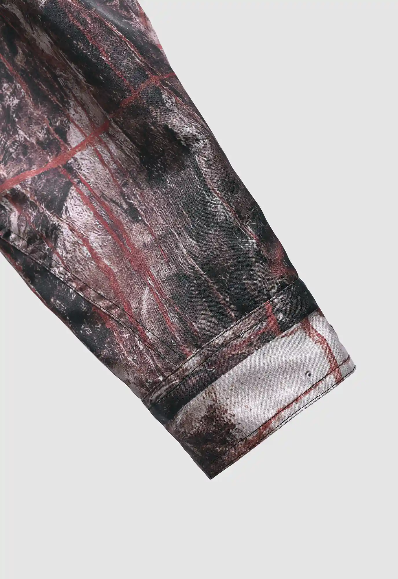 A relaxed fit jacket featuring an all-over running print that explores how surfaces retain marks over time, translating impressions of wear, fading, and erosion into a softened, lived-in feel.