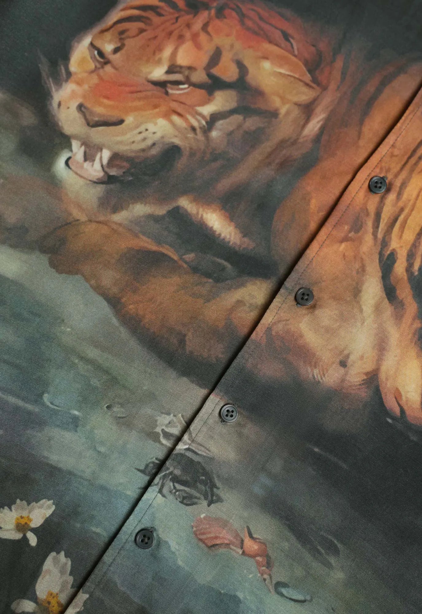 The artwork reflects global power dynamics, with the tiger as a symbol historically embroidered on military uniforms, including those from the Vietnam War.